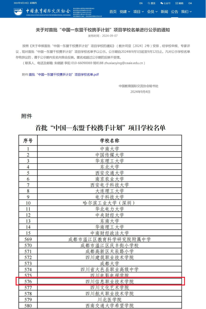 Recently, China Education Association for International Exchange issued the first batch of schools included in the “China- ASEAN Thousand Schools Hands Together Initiative”. SVCIT was successfully selected in the list.